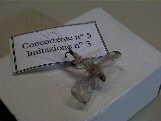 | Montaggio: realizzate le code con le fibre di gallopardo disposte a raggiera. bloccate nello stesso punto un quill chiaro di penna d'aquila avendo l'accortezza di fermarlo per la base. Create un sottocorpo conico ed avvolgete il quill. Prendete una strisciolina di materiale sintetico trasparente e tenendolo bloccato fra le dita ruotatelo per qualche giro come fosse una caramella. Se avete fatto un buon lavoro dovrà uscirne una farfallina. Legatelo a 3/4 del gambo dell'amo e poi con giri di dubbing incrociato realizzate il torace dell'imitazione. Tagliate le ali alla giusta lunghezza. | ||||