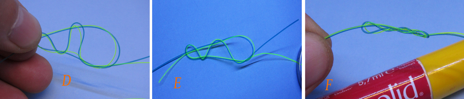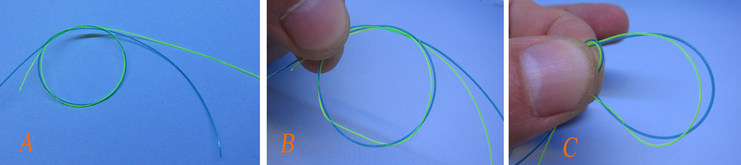 A: appaiare per qualche cm i due spezzoni di nylon che volete unire e formate il primo occhiello. La parte iniziale è identica al Triplo Surgeon.