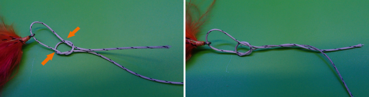 E' il nodo pił utilizzato per pescare con grosse imitazioni (steamer-popper). Utilizzando un'asola l'artificiale ha la massima libertą di movimento. Eseguire un nodo piano lasciandolo aperto. Inserire la mosca nel filo e tenerla nel palmo della mano sinistra. ![]() Inserire il capo libero dentro al nodo piano avendo l'accortezza di inserirlo nello stesso modo in cui esce (in questo caso esce da sopra-entra da sopra.) Avvolgere due o tre volte il capo corto attorno a quello lungo ![]() Inserire nuovamente il capo libero del nodo piano in modo che esca in modo opposto agli altri. Se il nodo viene bene il capo corto deve fuoriuscire a 90°