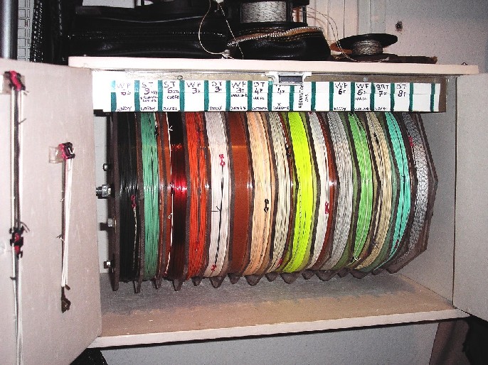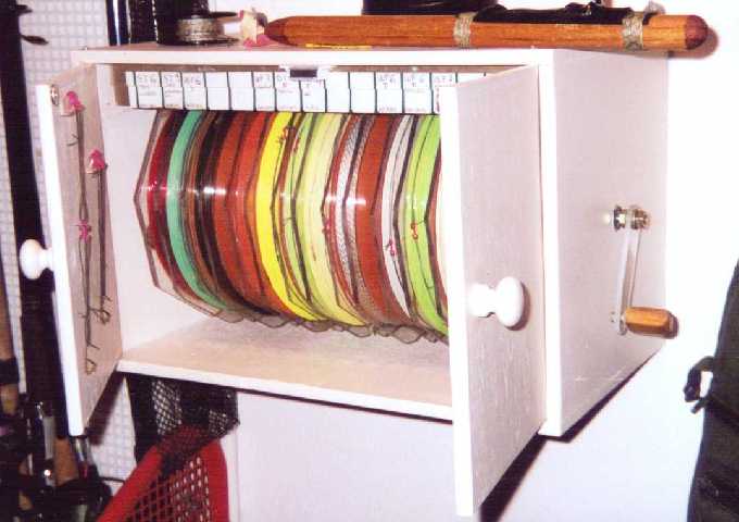 dall'inizio piuttosto che trovarsi tra qualche anno senza spazio a sufficienza. Utilizzando dei dadi stringete il tutto e tagliate l'eccedenza di barra filettata ad eccezione di quella centrale che servirà da asse di rotazione. Abbiate l'avvertenza, utilizzando due controdadi interni e della colla termica, di creare un corpo unico fra barra centrale e bobine. Dotate ogni gola di una linguetta fermafilo, facilmente ottenibile dal PVC di una bottiglia di plastica. Montando una manovella ed appoggiandolo ad un semplice trespolo può già essere utilizzato, ma io vi consiglio di interporre dei cuscinetti a sfera al fine di ridurre gli attriti e di collocarlo all'interno di una cassetta costruita "ad hoc" (i centri di bricolage possono fornire il legno già su misura) in modo da proteggere le nostre code da luce e polvere. Se poi ci volete realizzare anche un bel manico la potrete portare in macchina con voi qualora programmando una gita di pesca di più giorni riteniate utile di avere a disposizione tutto il vostro parco code. |
